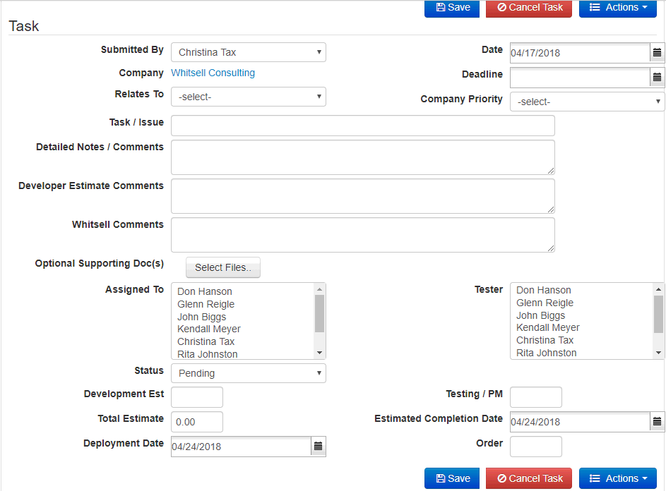 Completely customizable easy to use Help Desk solutions Standard Features + Track all ticket details + Track time opened and resolution time + Track activity you have had with the contact(s) + Set timers/reminders/follow ups + Full email notification workflow for both clients and employees + Download to Excel + Multiple file upload + Several security options + Multiple reporting options + Web based using XPages